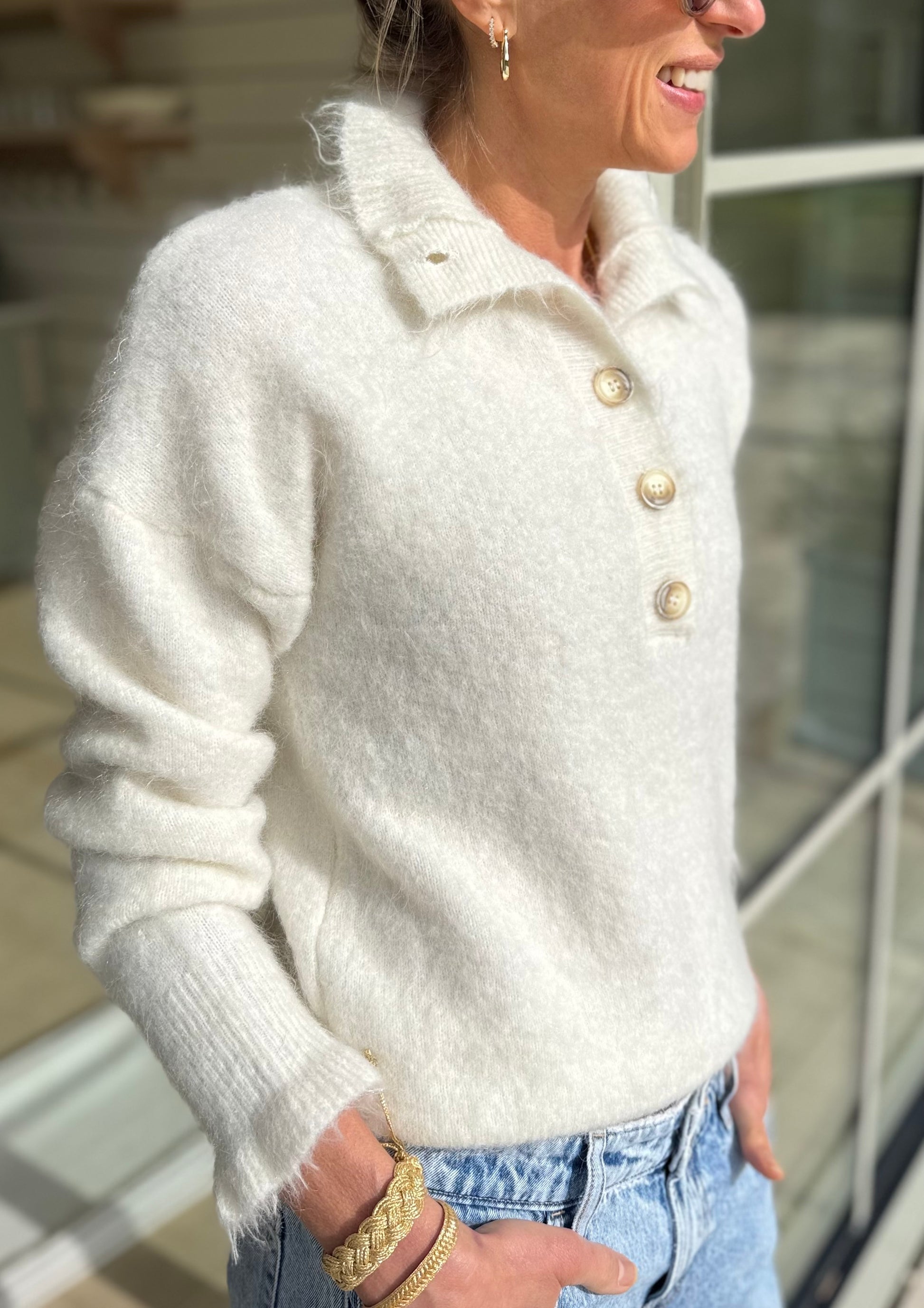 An elegant high neck knit with a quarter buttoned front. Soft touch and an easy everyday pullover.