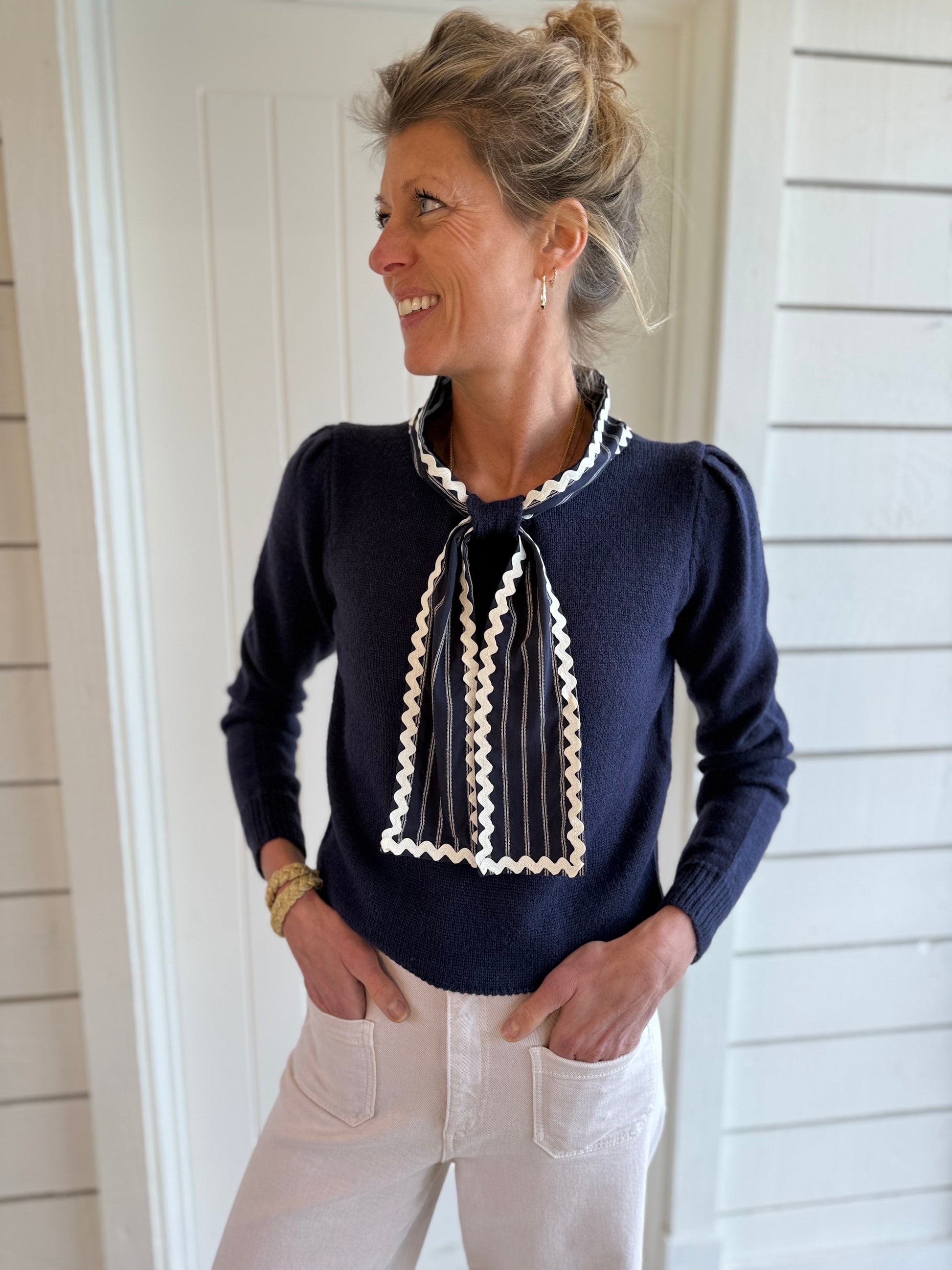 Add interest to your outfit with this striking tie-neck Cissbury Jumper. It has a beautiful, gathered shoulder detail and a ric-rac, striped tie detail collar. Need to give your knitwear a new lease of life - this is a great addition.