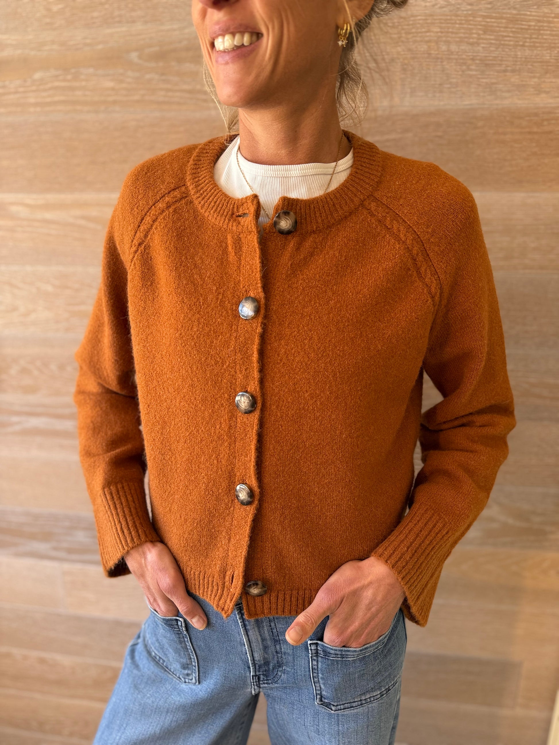 This flattering boxy burnt orange cardigan is perfectly on point for autumn with a buttoned front and flattering wide cuffs. Be at one with natures autumnal tones.