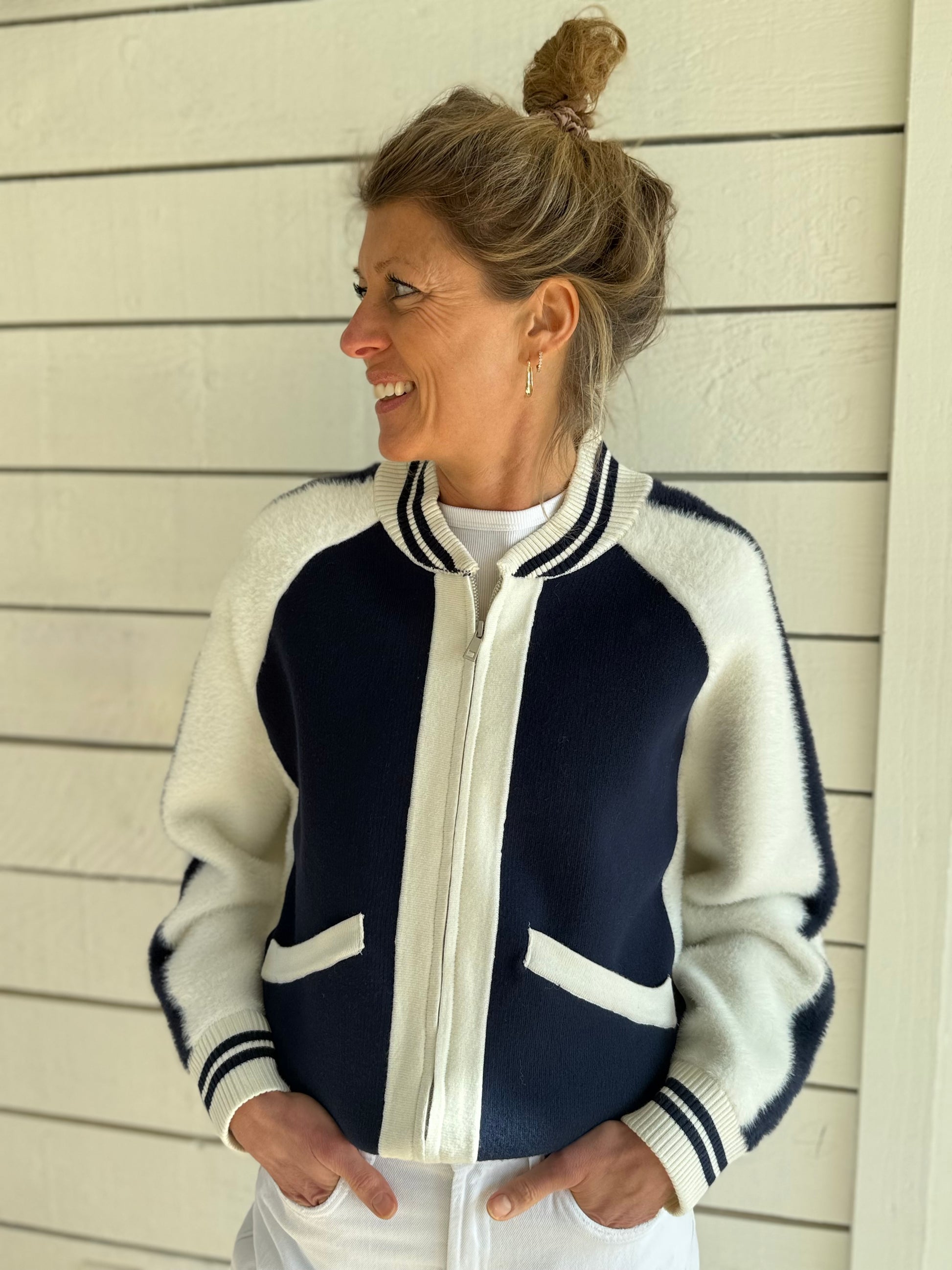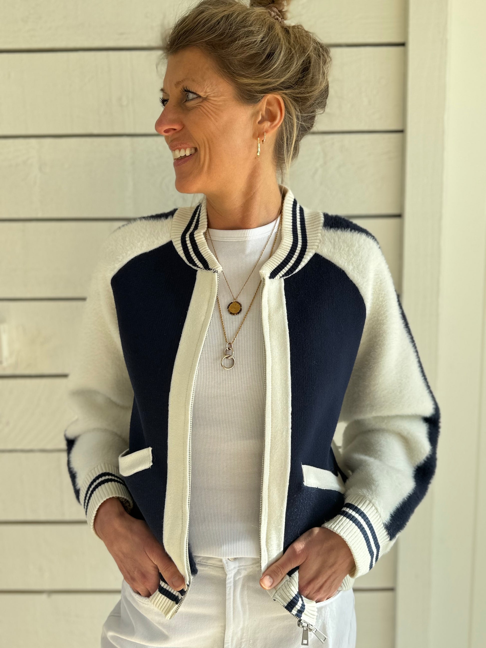Make an entrance in these vibrant varsity-style bomber jackets. Superb quality and excellent detailing adorns them throughout. In felted fabric with a relaxed fit, gently dropped shoulders, side pockets and ribbed cuffs and hem. Fully lined. This is outstanding outerwear!