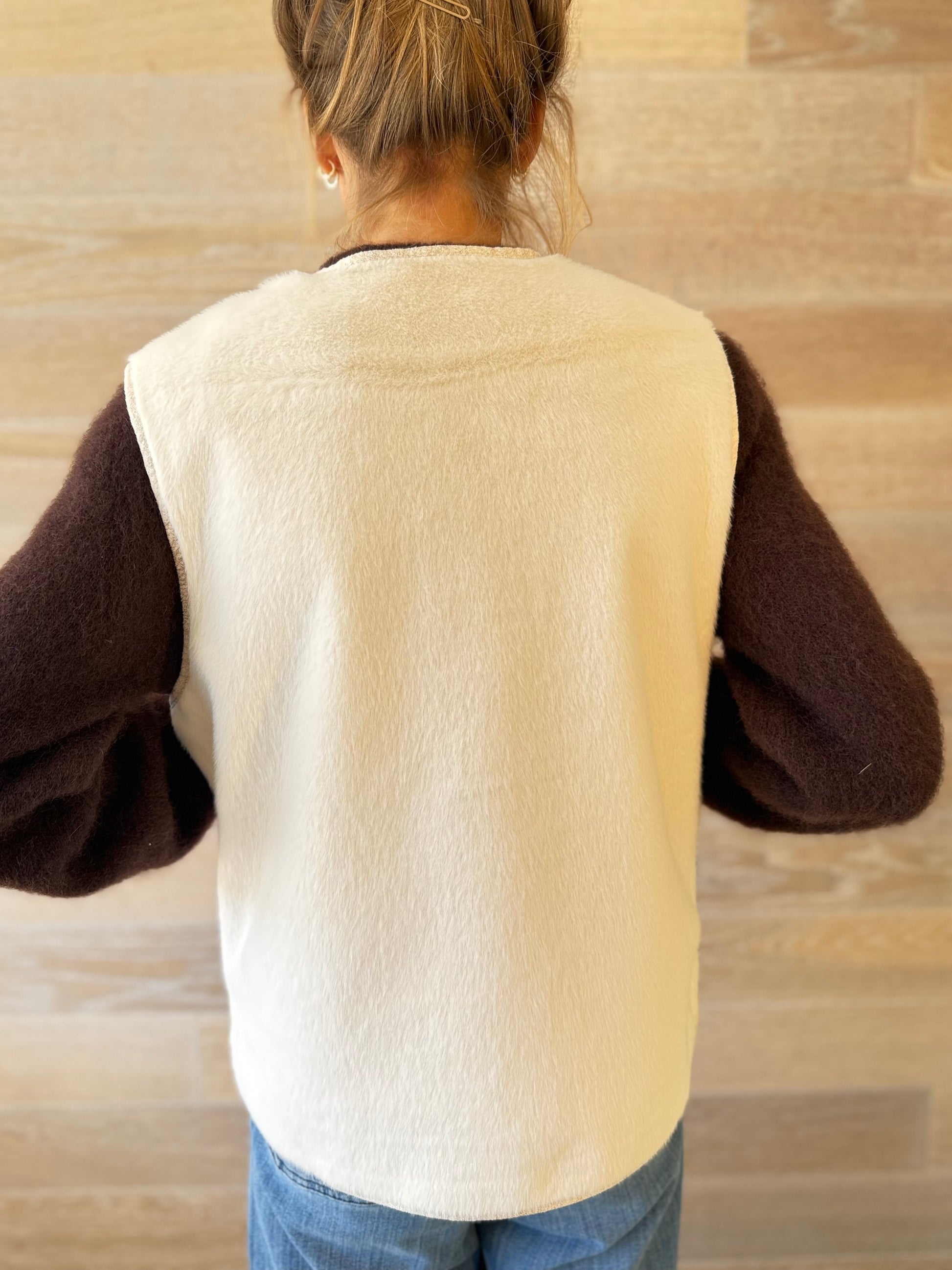 These faux-fur gilets are a wardrobe staple with front pockets and a zip-up closure. They are elegant enough to wear on a night out but equally useful as an extra layer under a jacket. Available in ecru, black and brown.
