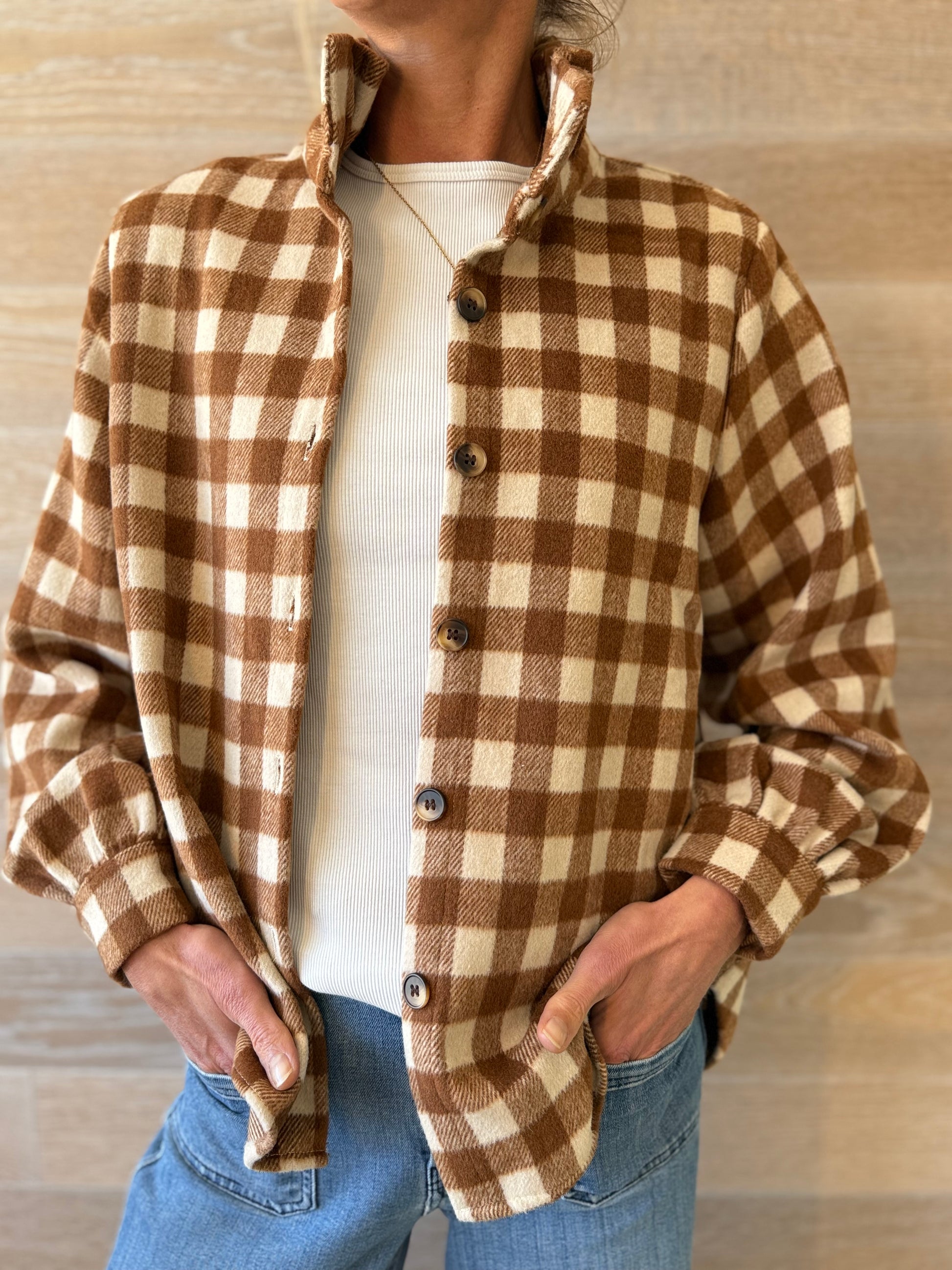 Change up your style in an instant with these á la mode overshirts. They are available in a rust check or a khaki cord. The high neck stand up collar adds an elegant and feminine touch.