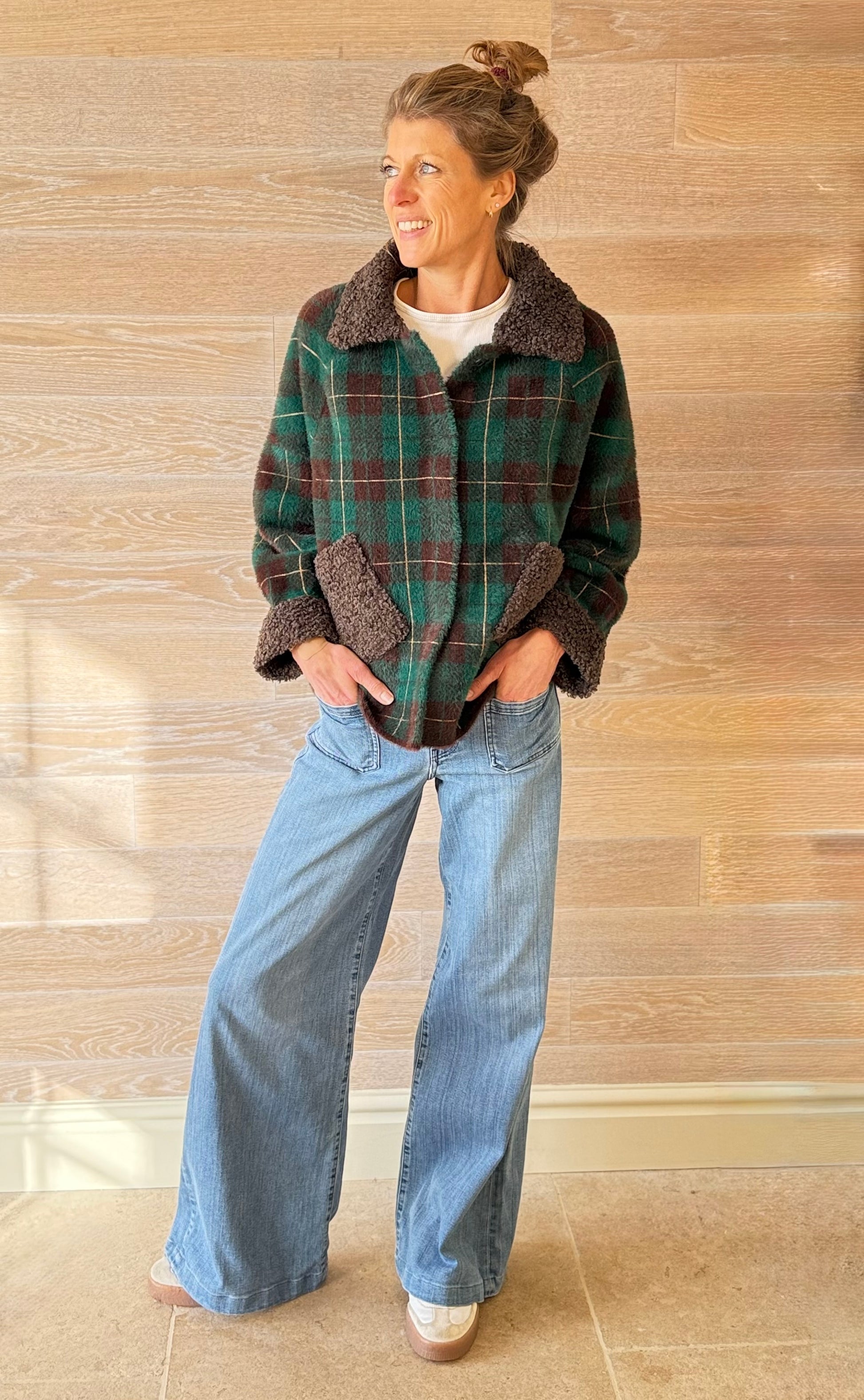 This chocolate and green short jacket with borg collar, cuffs and pockets is unbelievable soft and comfortable to wear. It's one of those ones you won't want to take off (even inside)!